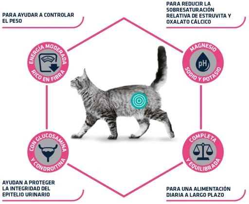 MODERATE ENERGY AND HIGH IN FIBER Moderate energy and high in fibre to help control weight. LOWER MAGNESIUM AND URINE PH Low in magnesium and urine pH, and higher sodium and potassium to reduce relative supersaturation (RSS) of struvite and oxalate. WITH GLUCOSAMINE AND CHONDROITIN With glucosamine and chondroitin: help protect the integrity of the urinary epithelium. COMPLETE AND BALANCED Complete and balanced diet for long-term daily nutrition. Chicken, maize protein, dehydrated poultry protein, maize flour, vegetable fibre, maize, wheat, dehydrated pork protein, hydrolysed animal protein, animal fat, wheat protein, salt, potassium chloride, fish oil, potassium citrate, glucosamine-chondroitin sulphate Urine acidifying substances: maize protein, ammonium chloride, methionine.