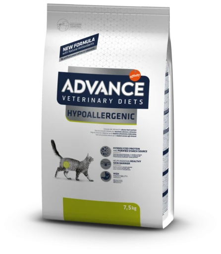ADVANCE VETERINARY DIETS – Hypoallergenic is a complete dietetic food for adult cats, created to reduce ingredient and nutrient intolerances, formulated with hydrolyzed protein sources and selected carbohydrate sources.