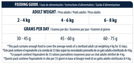 Helps prevent obesity in sterilized cats: Thanks to a reduced level of metabolisable energy, high fibre content to promote a feeling of fullness, high protein and moderate fat content to help maintain muscle mass.Helps reduce the risk of urinary problems: By promoting correct pH levels, boosting sodium levels to increase water uptake and urine output, and providing your cat with glycosaminoglycans that help to control the formation of urinary stones.Oat fibre and malt extract: Helps control the formation of hairballs and promotes their elimination.