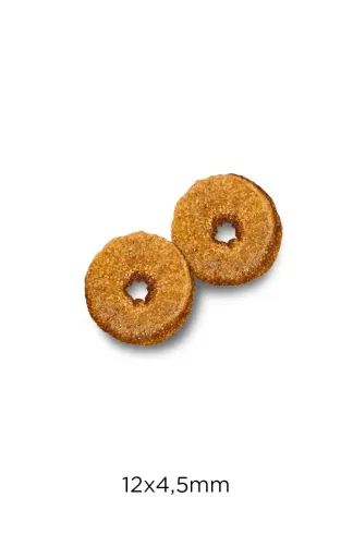 Fresh chicken (40%), dehydrated chicken meat (30%), Maize, rice (10%), hydrolysed chicken liver (5%), Maize gluten, rice protein, beetroot pulp, yeast, fish oil, sodium chloride, sodium polyphosphates, cellulose, potassium chloride, Inuline (0,1%, source of fructo oligosaccharides), Manano-oligosaccharides (0,1%), potassium chloride.