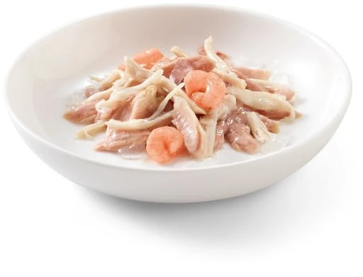 Careful selection of the very best parts of the meat and the fish, steam-cooked and hand-processed, in 100g pouch format. INGRDIENTS: Composition: Tuna 34%, Chicken fillets 23%, Shrimps 6%, Rice 1.5%.Nutrional Additives/Kg: Vit. A 1325 u.i., Vit. E 15 mg., Taurine 160 mg. Analytic components: protein 13%, crude oils and fats 1.5%, crude fibres 0.1%, crude ash 1%, moisture 84%, 79.7 kcal/100 g.