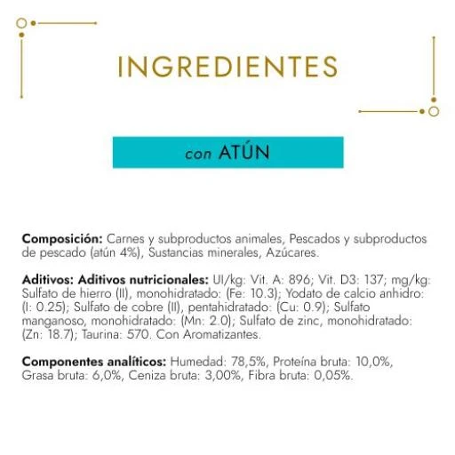 Composition: Meat and animal by-products, Fish and fish by-products (of which tuna 4%), Mineral substances, Sugars.