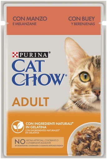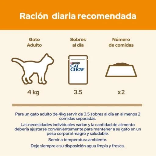 Your cat is amazing. To help you stay well, PURINA® CAT Chow® is formulated with quality protein and natural ingredients. Based on our experience in feline nutrition since 1926, Purina® Chow® CAT is a complete nutrition, balanced, with everything your cat needs to have an amazing and healthy life. With natural ingredients selected Complete food for adult cats. No dyes, flavors or preservatives artificial With Ox Tender pieces in gelatin eggplant Composition: Meat and animal (of which ox * 4%), Vegetable protein extracts, fish and fish derivatives *, substances minerals, vegetables * (0.8% eggplant dehydrated equivalent to 7% aubergine), sugars, yeasts *. * Natural ingredients. Additives: Nutritional additives: IU / kg Vit A: 670; Vit D3: 100; Vit E: 15; mg / kg: Taurine: 420; Iron sulfate (II), monohydrate (Fe: 7.7); Anhydrous calcium iodate (I: 0.19); Cupric sulfate pentahydrate (Cu: 0.7); Manganous sulfate monohydrate (Mn: 1.5); Zinc sulfate monohydrate (Zn: 14). Additives: Additives technology: mg / kg: cassia gum: Analytical 2900. Components: Humidity: 82% Crude protein 11.5%, crude fats and oils: 2.5%, Crude ash: 2.5%, crude fiber: 0.1% DIRECTIONS And Recommended daily Allowance: for an average adult cat (4 kg) serve 3 to 4 envelopes the day at the least 2 separate meals. Maintenance half rations for adults are based in cats with moderate activity under normal environmental conditions. Individual needs vary and the amount of food should be adjusted accordingly to keep your cat in a lean and healthy body weight. Serve at room temperature. Always leave at your disposal clean and fresh water. If you decide you’d like to feed him with Cat Chow® croquettes and these envelopes, please note that an envelope is roughly equivalent to 20g of croquettes and that this amount of food should be adjusted according to what is offered.