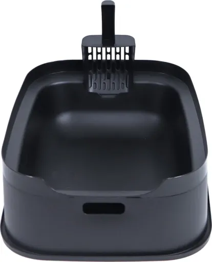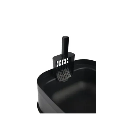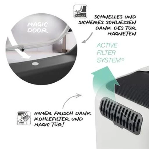 The flap and the base are equipped with a small magnet, so that the flap always falls neatly back into place. This also ensures that no unpleasant odors can escape from the toilet. The litter box is equipped with an odor filter and a litter scoop, which you can store on the inside of the box.