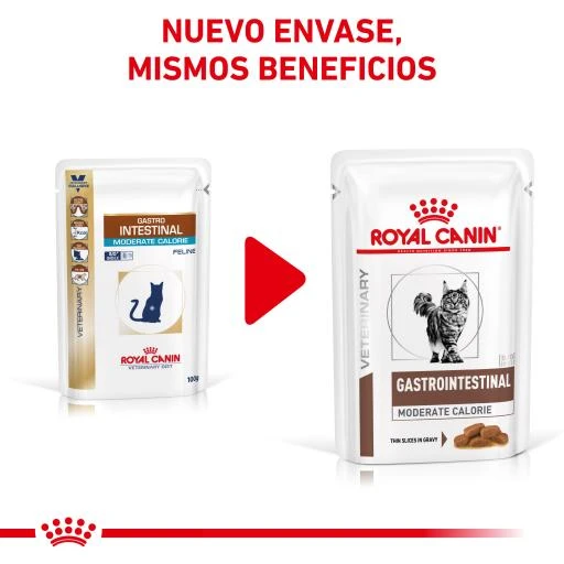 GASTRO-INTESTINAL MODERATE CALORIE is a complete dietetic feed for the nutritional management of cats formulated to reduce acute intestinal absorption disorders, and as compensation from maldigestion.