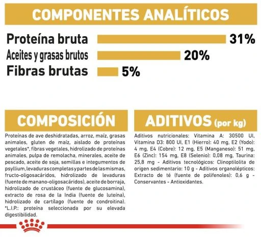 COMPOSITION: dehydrated poultry protein, rice, maize, animal fats, vegetable protein isolate, maize gluten, vegetable fibres, hydrolysed animal proteins, beet pulp, minerals, soya oil, fish oil, psyllium husks and seeds, fructo-oligo-saccharides, hydrolysed yeast (source of manno-oligo-saccharides), borage oil, green tea extracts(source of polyphenols), hydrolysed crustaceans (source of glucosamine), marigold extract (source of lutein), hydrolysed cartilage(source of chondroitin).