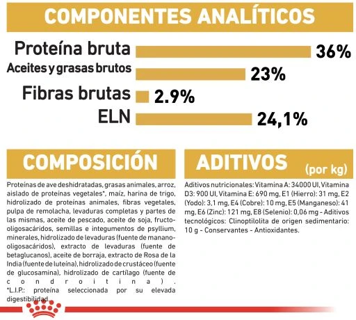COMPOSITION: dehydrated poultry protein, rice, animal fats, vegetable isolated proteins *, maize, hydrolysed animal proteins, vegetable fibers, yeasts, beet pulp, fish oil, minerals, soya oil, fructo-oligosaccharides, seeds and psyllium husks, hydrolysed yeast (source of mannan-oligosaccharides), borage oil, extract Rosa India (source of lutein), hydrolysed crustaceans (source of glucosamine), hydrolysed cartilage (source of chondroitin).