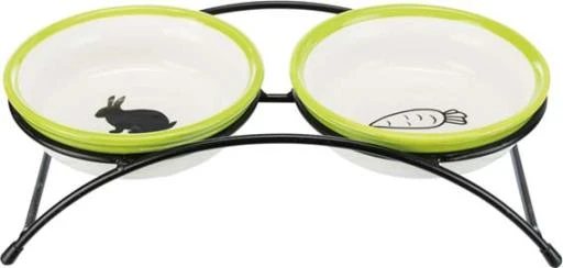 There are different materials from which to feed the pet. It is also important to prioritize their needs and find their specific feeder in case they need to eat up high, they are too eager to eat or their long ears get in the way and get soaked with food. Features:- Protects food against feces and urine- 2 ceramic feeders with metal support- Metal structure, oven lacquered, black- Non-slip rubber feet- Color: white/greenCapacity 2 bowls of 300 ml Diameter ø 13 cm